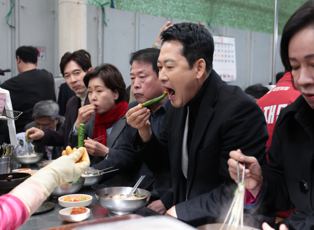 국민의힘 장동혁 대표가 11일 대구 서문시장을 찾아 잔치국수를 먹고 있다. 김영진 기자 kyjmaeil@imaeil.com