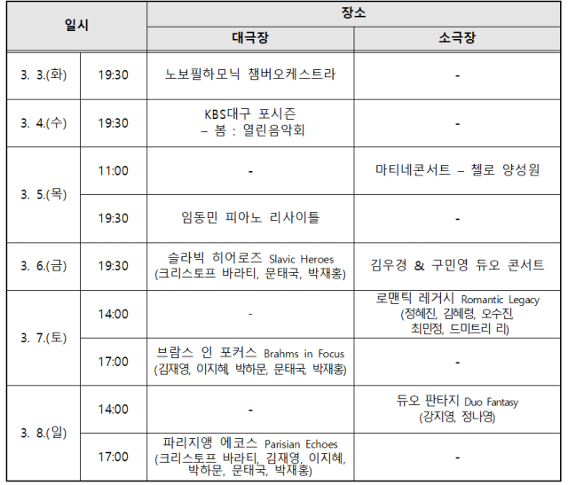 수성아트피아의 봄 시즌 클래식 축제인 '봄음악제'가 3월 3일부터 8일까지 대극장과 소극장에서 펼쳐진다.