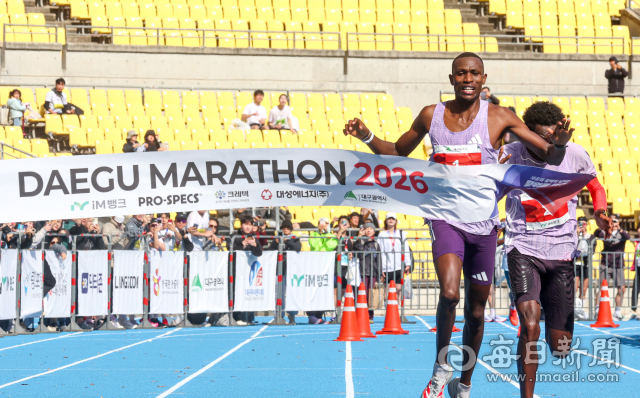 22일 오전 대구 수성구 대구스타디움에서 열린 '2026 대구마라톤대회'에서 탄자니아 국적의 게브리엘 제럴드 게이 선수가 2시간 8분 05초를 기록, 전체 1등으로 결승선을 통과하고 있다. 안성완 기자 asw0727@imaeil.com