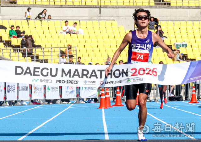 22일 오전 대구 수성구 대구스타디움에서 열린 '2026 대구마라톤대회'에서 대구시청 이동진 선수가 2시간 20분 41초의 기록, 국내 남자부 1등으로 결승선을 통과하고 있다. 안성완 기자 asw0727@imaeil.com