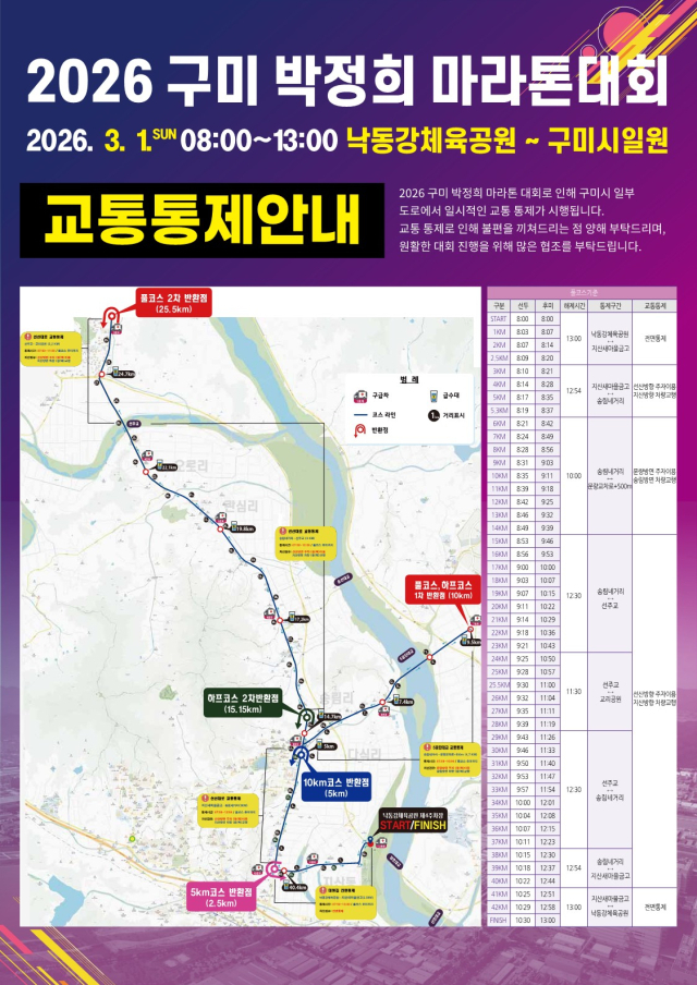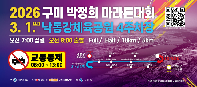경북 구미시가 오는 3월 1일 '2026 구미 박정희 마라톤대회' 개최에 맞춰 지역내·외 참가자를 위한 셔틀버스를 운행하고, 대회 당일 주요 도로 구간에 대한 교통통제를 실시한다.