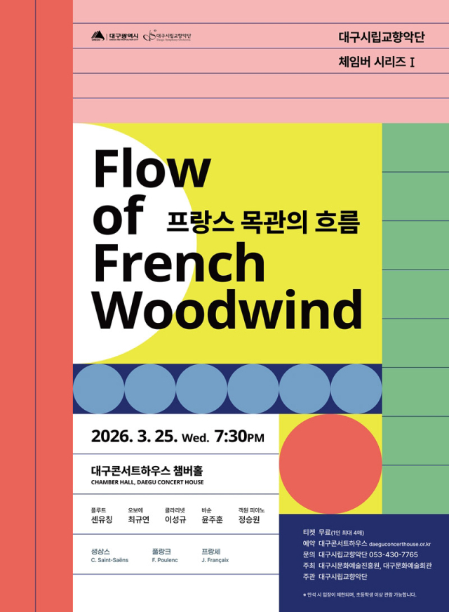 대구시립교향악단의 단원들이 고품격 실내악을 들려주는 '체임버 시리즈'의 무대다. 셴유칭(플루트), 최규연(오보에), 이성규(클라리넷), 윤주훈(바순), 정승원(피아노)이 참여해 생상스의 '타란텔라, Op.6', 풀랑크의 '오보에, 바순과 피아노를 위한 3중주, FP 43', 프랑세의 '목관 4중주' 등 프랑스 작곡가의 목관 중심 레퍼토리를 연주한다.