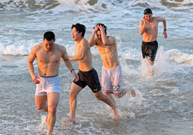 15일 포항 용한리 간이해수욕장을 찾은 학생들이 차가운 바닷물에 뛰어들었다 나오며 환호하고 있다. 낮 최고기온이 12℃ 안팎에 머무르는 쌀쌀한 날씨 속에서도 학생들의 웃음이 해변에 봄기운을 전하고 있다. 김영진 기자 kyjmaeil@imaeil.com