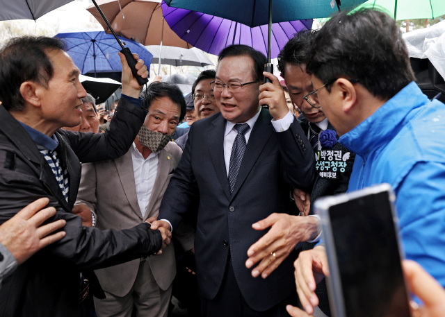 김부겸 전 국무총리가 30일 대구 2·28 기념중앙공원에서 6·3 지방선거 대구시장 출마 선언을 마친 뒤 시민들과 악수를 하며 이동하고 있다. 김영진 기자 kyjmaeil@imaeil.com