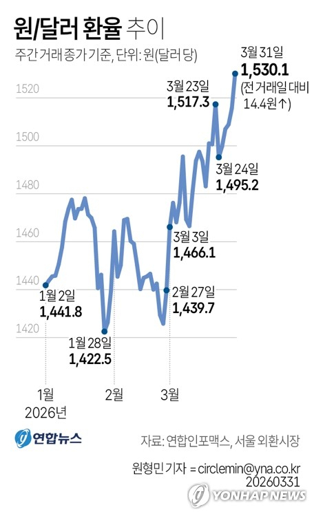원·달러 환율이 1,530원을 넘어서며 2009년 금융위기 이후 최고치를 기록했다. 중동 전쟁 장기화에 따른 에너지·원자재 쇼크로 실물경제에도 비상등이 켜졌다.