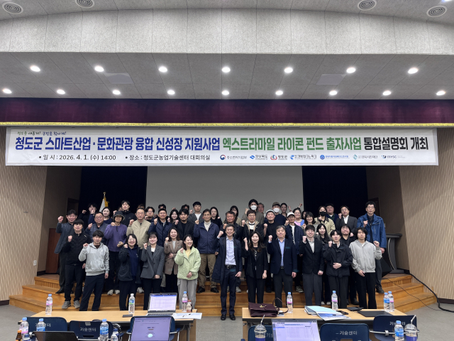 청도군(군수 김하수)은 지난 1일 청도군 농업기술센터 대회의실에서 지역 중소기업, 소상공인, 청년 창업가 등 100여 명이 참석한 가운데 '청도군 스마트산업·문화관광 융합 신성장 지원사업'과'엑스트라마일 라이콘펀드' 통합 사업설명회를 개최했다.