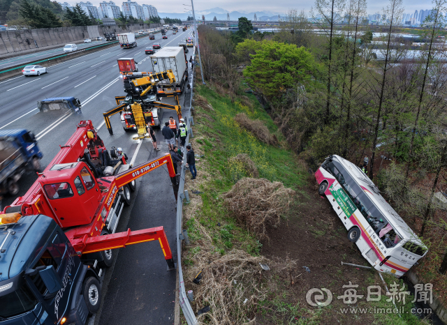 6일 오후 4시 10분쯤 대구 북구 팔달동 경부고속도로 금호나들목 인근에서 부산 방향으로 달리던 45인승 시외버스가 도로 옆 가파른 사면 아래로 굴러 떨어져 운전자와 승객 등 8명이 경상을 입었다. 경찰은 화물차량과 트레일러가 빗길에 미끄러지면서 옆 차로를 달리던 버스와 부딪혀 사고가 난 것으로 파악하고 있다. 안성완 기자 asw0727@imaeil.com