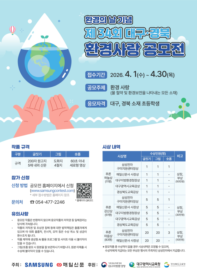 삼성전자와 매일신문사가 공동 주최하는 '제34회 환경사랑 공모전'이 4월 30일까지 온라인 접수를 진행한다.