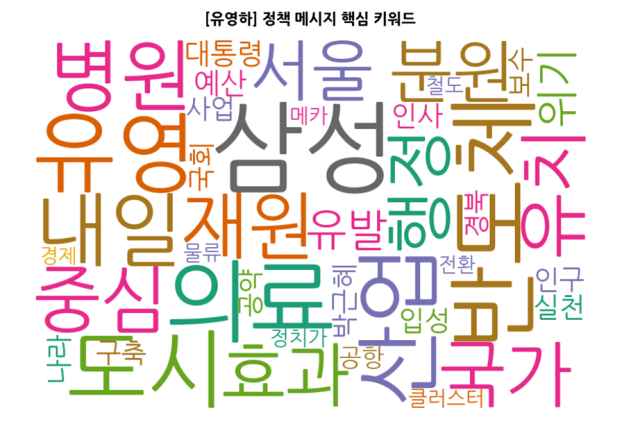 윤재옥 의원의 주요 키워드는 '리더십', '실속', '야전' 등으로 전략가 이미지를 부각하고 있다. 야당 후보로서 정부·여당과의 원활한 소통 능력을 강조한 것으로 보인다. 유영하 의원의 경우 '삼성', '반도체', '의료' 등 본인의 대표 공약을 적극적으로 내세우고 있다. 대기업을 움직여 지역을 획기적으로 바꿔보겠다는 취지다.