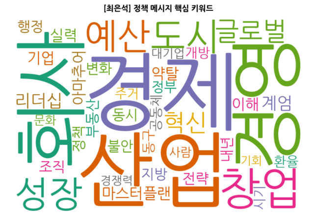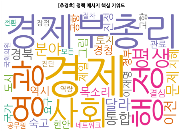 7일 국민의힘 경선 후보 6명의 발언을 분석한 결과 추경호 의원과 최은석 의원은 '경제'를 가장 많이 언급, 공통된 메시지를 보였다. 다만 추 의원은 '경제부총리', '행정' 등 경제관료의 모습을 강조한 반면 최 의원은 '산업', '경영', '회사' 등 대기업 CEO 출신의 경험을 앞세웠다. 둘 모두 경제를 전면에 내세웠으나 접근 방식에는 차별화를 시도한 것으로 분석된다.