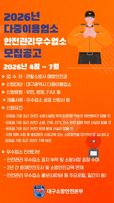 대구소방안전본부는 안전한 업소 환경 보전과 영업주의 자율적인 안전관리 의식을 높이기 위해 '2026년 다중이용업소 안전관리 우수업소' 신청 접수를 진행한다고 14일 밝혔다.