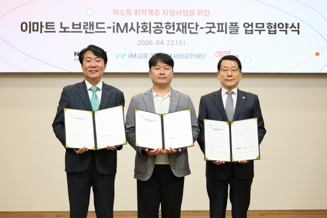 iM금융그룹 iM사회공헌재단(이사장 황병우)은 22일 서울 굿피플빌딩에서 이마트 노브랜드, 굿피플인터내셔널과 함께 취약계층 복지증진을 위한 업무협약을 체결했다.