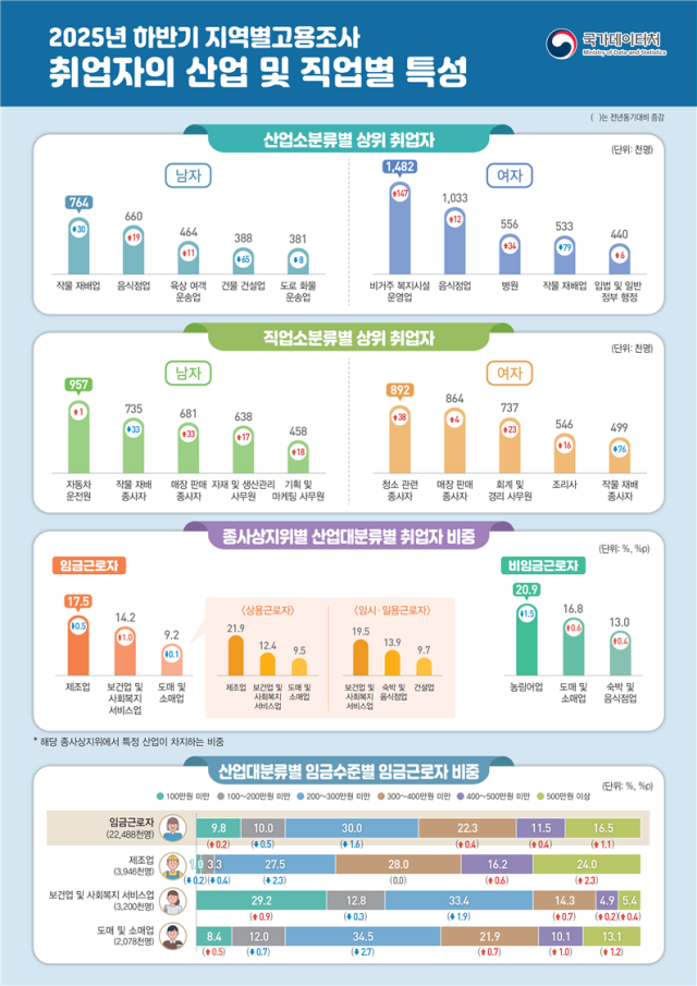직업별로는 '매장 판매 종사자'가 154만5천명으로 전체 1위를 차지했으며, '청소 관련 종사자'(130만1천명)가 뒤를 이었다. 특히 청소 관련직은 1년 만에 5만2천명 늘어나며 복지 일자리와 함께 증가세를 견인했다.