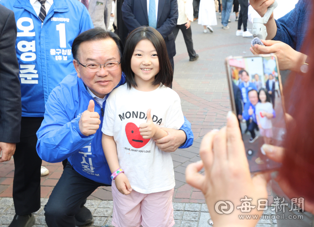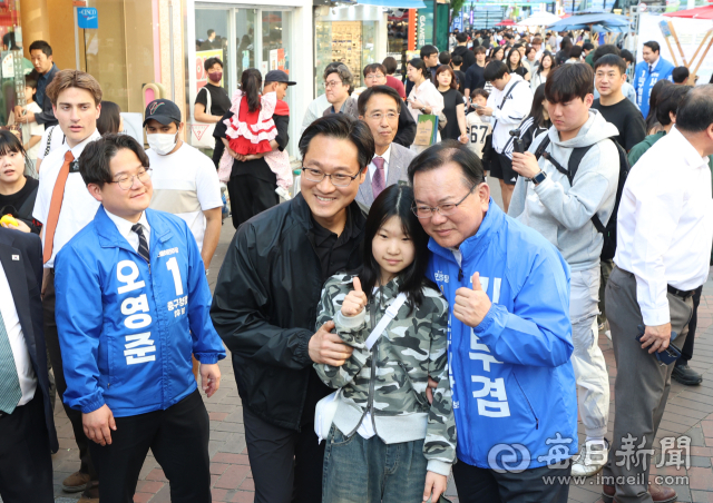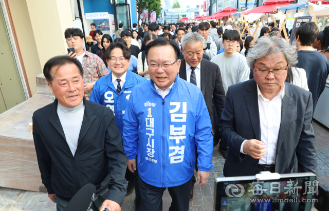 6.3 지방선거에서 대구시장에 출사표를 던진 김부겸 더불어민주당 예비후보가 25일 대구 중구 동성로에서 유권자들을 만나 인사를 나누고 있다. 안성완 기자 asw0727@imaeil.com