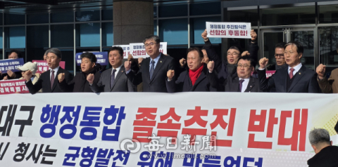 28일 오후 1시, 경북도의회 마당. 대구경북행정통합에 반대하는 '경북대구행정통합 비상대책위원회(이하 경북대구통합비대위)'가 이곳에 모여 집회를 열었다. 도의회 정문 앞에는 대형 현수막이 걸렸고, 음향시설이 설치되자 지나던 민원인과 공무원들의 발길도 잠시 멈췄다. 이날 집회에는 경북 북부지역을 대표하는 도의원들이 대거 모습을 드러냈다. 도기욱(예천) 의원을 비롯해 권광택·김대일·김대진(안동), 임병하(영주), 박창욱(봉화), 윤철남(영양) 도의원이 현장에 함께했다. 이들은 집회 내내 현수막 앞에 나란히 서서 비대위의 입장문 발표를 지켜봤다. 마이크를 잡은 것은 도 도의원이었다. 첫 문장은 단순했고, 현장의 분위기는 그 한마디에 집중됐다. "경북대구 행정통합에 반대합니다." 이어진 발언은 한층 날이 섰다. 도 도의원은 "졸속 추진과 불균형 통합은 지역의 미래를 위협한다"며 "지금과 같은 통합 방식으로는 지방소멸과 인구감소라는 구조적 위기를 해결할 수 없고, 오히려 회복하기 어려운 지역 불균형과 행정 불신만 키울 우려가 크다"고 주장했다. 그는 행정통합 추진 과정 자체에 문제를 제기했다. "행정통합 논의는 2024년 이후 사실상 중단돼 있다가 중앙정부 발표 이후 불과 두 달 만에 급박하게 재개됐다"며 "그 과정에서 북부권과 인구소멸지역을 위한 구체적인 재정·산업 지원 계획은 찾아볼 수 없다"고 지적했다. 대구 중심의 구조에 대한 우려도 빠지지 않았다. 도 도의원은 "인구와 재정, 권력이 대구로 집중될 수밖에 없는 구조에서 북부권과 농산어촌 지역은 '배려 대상'으로 밀려나거나 정책 우선순위에서 제외될 가능성이 크다"며 "정부가 제시한 재정 지원 방안 역시 실체와 신뢰성이 부족하다"고 말했다. 행정통합 이후의 권한 구조에 대해서도 불확실성이 크다고 했다. 그는 "통합 이후 의회 구성, 선거구 조정, 자치권 보장 등 핵심 제도 설계가 여전히 공백 상태"라며 "이대로 통합이 추진될 경우 지역의 정치적 발언권 약화로 이어질 수 있다"고 강조했다. 집회가 이어지는 동안 도의회 마당에는 간간이 구호가 울렸고, 참석자들은 고개를 끄덕이며 발언에 호응했다. 경북대구통합비대위는 이날 입장문을 통해 "충분한 공론화와 지역별 맞춤 대책 없이 추진되는 행정통합에는 동의할 수 없다"는 입장을 분명히 했다.