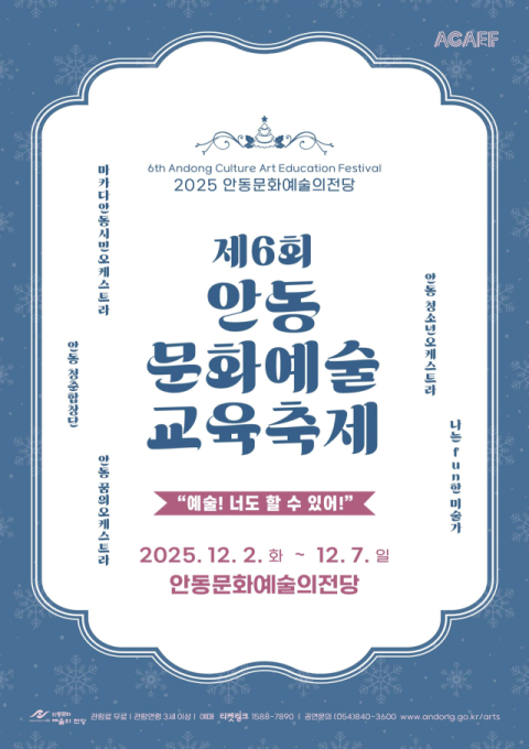 안동문화예술의전당이 추진해 온 각종 문화예술교육을 통해 성장해 온 주민들의 문화예술적 삶을 한 눈으로 살필 수 있는 '제6회 안동문화예술교육축제'가 열린다. 안동예당은 12월 2일부터 7일까지 열릴 이 축제는 지역 시민과 청소년들이 약 10개월간 참여해 온 안동문화예술의전당 문화예술교육 프로그램의 성과를 시민과 나누는 자리로 정기연주회와 전시가 함께 진행된다. 음악 프로그램에는 4일 저녁 7시 30분 '마카다안동시민오케스트라', 5일 7시 30분 '안동 청춘합창단'의 공연이 열리고, 6일에는 오후 2시 '안동 꿈의오케스트라', 저녁 7시 '안동 청소년오케스트라'가 공연된다. 각 단체는 약 10개월 동안 꾸준한 합주와 교육을 거쳐 완성도 높은 무대를 준비해 왔으며, 오케스트라와 합창이 어우러진 풍성한 정기연주회를 안동문화예술의전당 웅부홀에서 선보일 예정이다. 또, 전시 프로그램으로 안동문화예술의전당 34갤러리에서 '나는 fun한 미술가' 전시회가 12월 2일에서 12월 7일까지 함께 열린다. 전시는 수강생들이 약 10개월간 다양한 미술 창작 프로그램을 통해 제작한 작품들을 공개하는 자리로, 수채화와 유화의 작품들이 전시된다. 이번 전시는 예술교육이 수강생들의 삶과 감수성에 어떤 변화를 만들어내는지를 작품으로 보여줄 전망이다. 이번 축제는 지역 주민들이 예술교육을 통해 쌓아온 과정과 성장을 시민이 직접 확인할 수 있는 행사로, 세대와 장르를 아우르는 공연․전시가 준비돼 뜻깊은 행사가 될 전망이다. '제6회 안동문화예술교육축제'의 공연과 전시는 3세 이상 누구나 관람할 수 있다. 자세한 일정과 관람 안내는 전화(054-840-3600)로 문의하거나 안동문화예술의전당 누리집(http://www.andong.go.kr/arts)에서 확인할 수 있다.